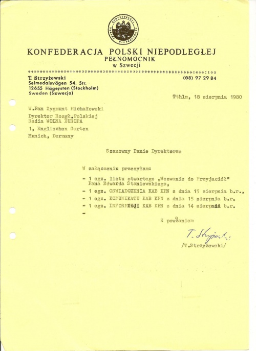 ad. 6. Prowadząc działalność Biura Informacyjnego KPN w Szwecji koncentrowałem się głównie – o czym wyżej wspomina Władek – na bardzo ważnym odcinku jego działalności. Było to informowanie opini społecznej w Kraju o działalności opozycji niepodległościowej – obok tej już przez RWE rozpropagowanej, czyli KORowskiej. Ta informacyjna działalność była dotąd z przyczyn „obiektywnych” bardzo zaniedbana. Przyczyną tego stanu był monopol w dostępie do głównych polskich centrów opiniotwórczych na Zachodzie, znajdujący się w rękach KORu. Działo się tak dzięki przeniknięciu do tych centrów rzeczników „lewicy laickiej”, którzy wraz z wielotysięczną falą emigracji, składającą się z byłych aparatczyków komunistycznych – tzw. „pomarcowców” przybyli w 1968 roku na Zachód. Centrami tymi były: RWE, „Kultura” paryska i skupiony wokół rządu emigracyjnego ośrodek londyński. Tworzyły one – dzięki znajdującym się w nich aktywistom „lewicy laickiej” i sympatykom KOR - system naczyń połączonych. Podjąłem się zatem niełatwego zadania – przełamywania utworzonych przez tych ludzi barier. Jak poważne były trudności, na które napotkałem, niech świadczy treść poniższej korespondencji, obrazującej ewolucję moich kontaktów z RWE. Niewielkim, no ale jednak ułatwieniem okazało się głośne wówczas zdemaskowanie przeze mnie cenzorskiej działalności Głównego Urzędu Kontroli Prasy, Publikacji i Widowisk w Warszawie. Pierwszym sukcesem było odczytanie przez spikera aktu założycielskiego KPN oraz obszernych fragmentów „Platformy Wyborczej KPN” w 1980 roku. Oprócz tego stale dostarczałem do RWE nagrywane przez telefon teksty wszystkich dokumentów wydawanych przez Biuro Polityczne i KAB KPN. Treść ich przekazywał mi Leszek Moczulski i Tadeusz Stański. Raz lub może dwa razy otrzymałem je również od Romualda Szeremietiewa. Nagrywałem je przy pomocy mikrofonu przyklejonego do słuchawki telefonu. (Część kaset z tymi nagraniami zachowała się do dziś. Może warto byłoby je jakoś zarchiwizować?) Trwało to nieraz bardzo długo, bo bezpieka przerywała połączenia, co wymagało ponownego łączenia się z innych już telefonów. Jakość tych nagrań była więc też nienajlepsza. Sklecałem je następnie i przepisywałem do późna w nocy, aby jak najszybciej móc je wysłać do RWE i innych emigracyjnych ośrodków. Początkowo kontakty z dyrektorem RWE Zygmuntem Michałowskim – jak to widać z załączonych listów – nabrały charakteru niemalże serdecznego, by jednak stopniowo, pod wpływem narastającej perswazji ze strony zatrudnionych w radiostacji „pomarcowców” – stać się coraz bardziej niechętne w tonie i treści. W sumie udało mi się jednak dotrzeć do opinii publicznej w kraju z nadspodziewanie obszerną – jak na opisane wyżej uwarunkowania – informacją o walce toczonej w Kraju przez KPN i o prześladowaniach jej członków przez aparat bezpieczeństwa.