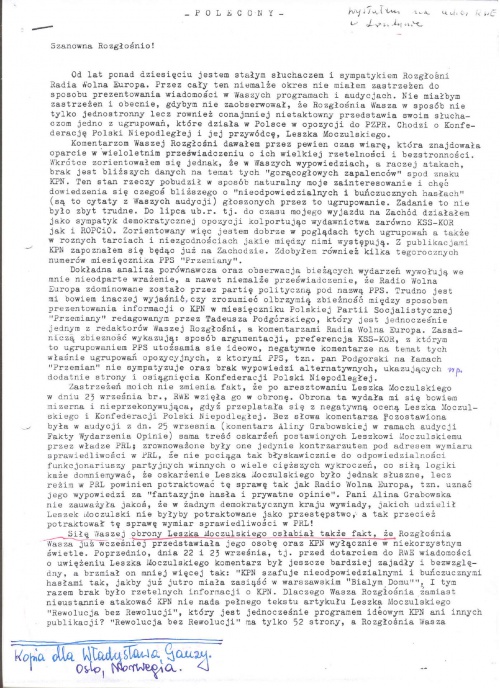 Od chwili swego powstania KPN jest jedynym niezależnym ugrupowaniem politycznym w kraju, które przy różnych okazjach przedstawiane jest przez RWE niechętnie, pomniejszająco i złośliwie. Gdy powstał KOR i później KSS „KOR”, w depeszach agencyjnych z Polski, co jest sprawą powszechnie znaną, nie brakowało wątpliwości pod adresem tej cennej społecznie inicjatywy. Wówczas jednak – i bardzo słusznie – RWE nie powtarzała żadnych z tych pogłosek i krytyk. Ton RWE wobec KSS „KOR” jest niezmiennie entuzjastyczny, ton wobec KPN – w najlepszym wypadku powściągliwy. Rozbiciu jednej konferencji prasowej u Jacka Kuronia RWE poświęciła znacznie więcej czasu niż rozbiciu trzech konferencji prasowych u Leszka Moczulskiego. O wkroczeniu SB do mieszkania Leszka Moczulskiego – tego samego dnia co i do Kuronia – RWE była poinformowana, lecz nie wspomniała o tym ani słowem.